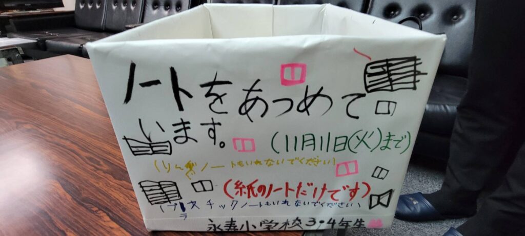 この企画は永寿小学校3.4年生の皆さんが中心となり、使用済みノートのリサイクル活動を通して、