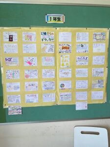 中学校の廊下にある掲示板に各学年ごとにおススメ図書をカードにデザインし、掲示されています。