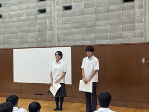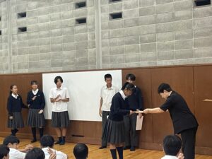 9月11日(木)に2学期最初の全校集会を実施しました。全校集会では、今夏、各クラブの大会で優秀な成績を残してくれた選手の皆さんへの
