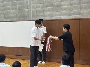 大阪大会、近畿大会、全国大会で活躍してくれた陸上部、水泳部、ハンドボール部の皆さんへの表彰式が行われました。