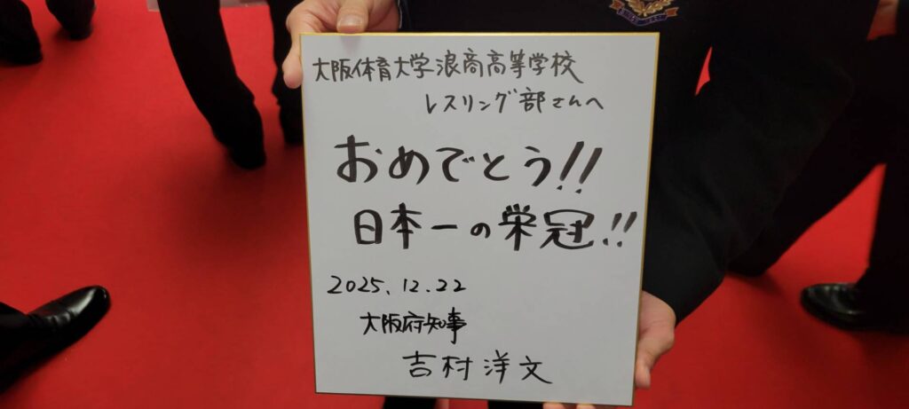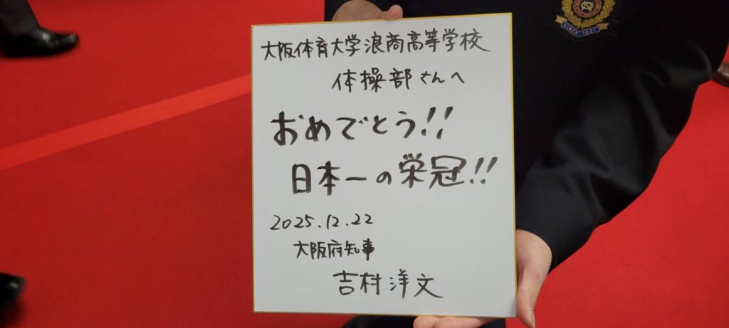 記念品として直筆の色紙を頂戴することができました。最後は吉村知事とともに記念撮影を行いました。