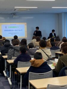 令和8年度の入学試験に合格された児童の皆さん、保護者の皆様方にご出席いただき、入学後の中学校生活についての説明及び
